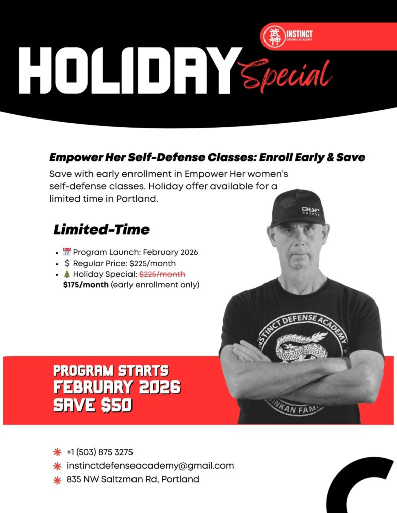 Women safety is not a luxury anymore, it’s a necessity. Every woman deserves to feel confident, strong, and capable of protecting herself in any situation. Instinct Defense Academy proudly presents its exclusive “Empower Her” Women’s Self-Defense Program, launching in February 2026 in Portland – with a special Holiday Early Enrollment Offer.